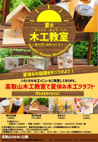夏休みの自由工作に、高取山の木を使って貯金箱やペン立てなどの木工体験をしてみませんか?